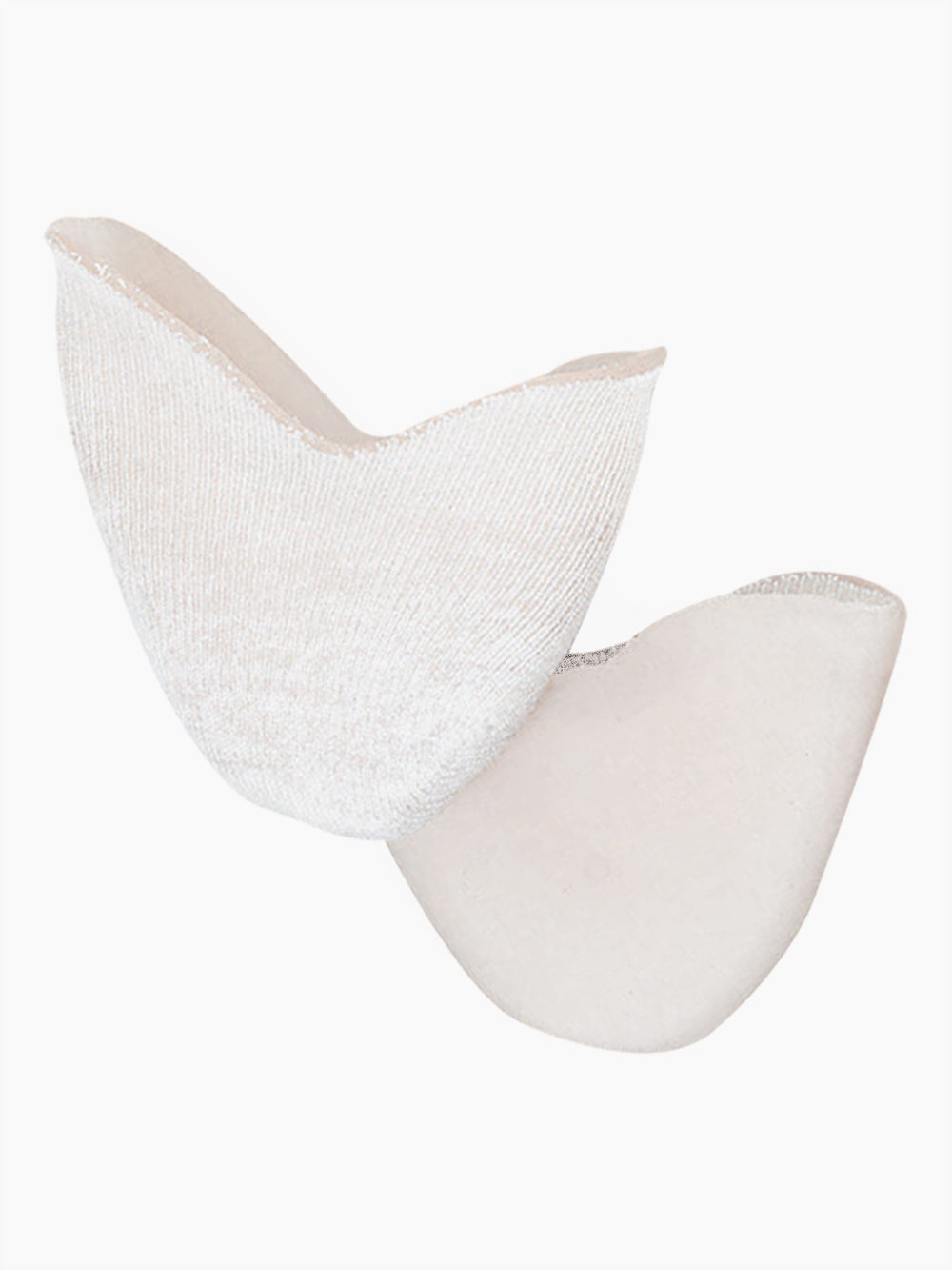 One side is a uniquely knitted, white seamless sock made of Cool Max®, which helps wick away moisture. The other side is a specially formulated non – silicone polymer designed to absorb shock and reduce impact to the foot. Reversible.